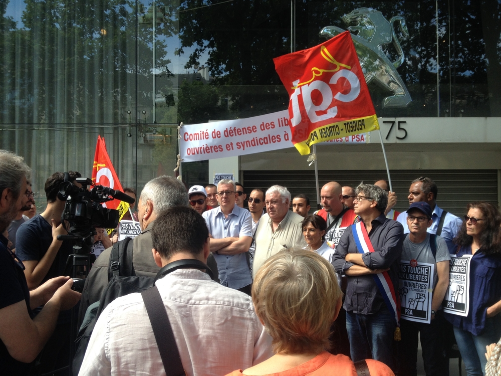 Samedi 8 juillet : nous voici de retour devant le siège de PSA, avenue de la Grande Armée, trois ans après les multiples rassemblements contre la fermeture du site d’Aulnay. Cette fois, c’est la lutte cotre la répression dans le groupe PSA qui nous rassemble. La veille même la condamnation de Farid Borsali, secrétaire du syndicat CGT de l’usine Peugeot de Poissy à six moins de prison avec sursis et à 2 600 € d’amende par le tribunal correctionnel de Versailles venait confirmer que l’objectif de la direction du groupe PSA est de prévenir toute possibilité de résistances dans les batailles qui sont inéluctables au vu des objectifs du groupe.