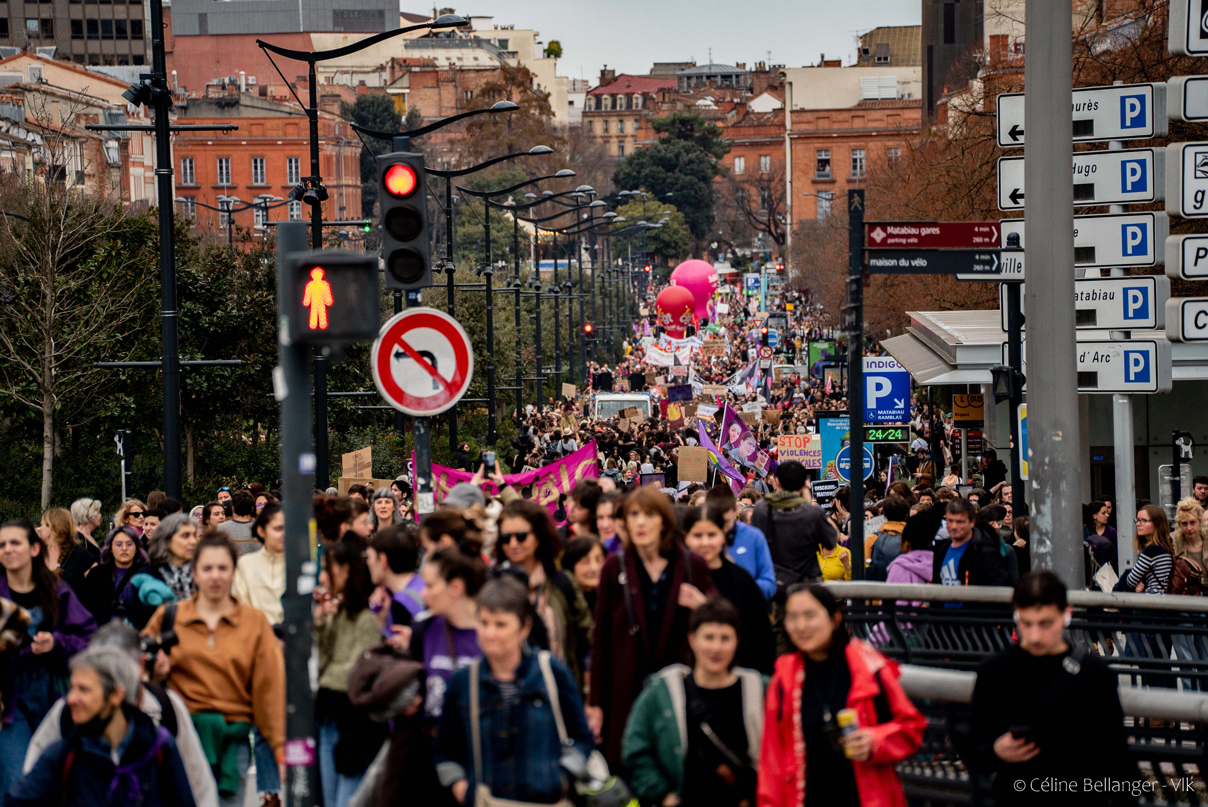 Ce 8 mars 2023, 25 000 personnes ont défilé dans les rues de Toulouse, derrière une banderole de tête unitaire réunissant les organisations féministes de la ville et les huit syndicats mobilisés contre la réforme des retraites.