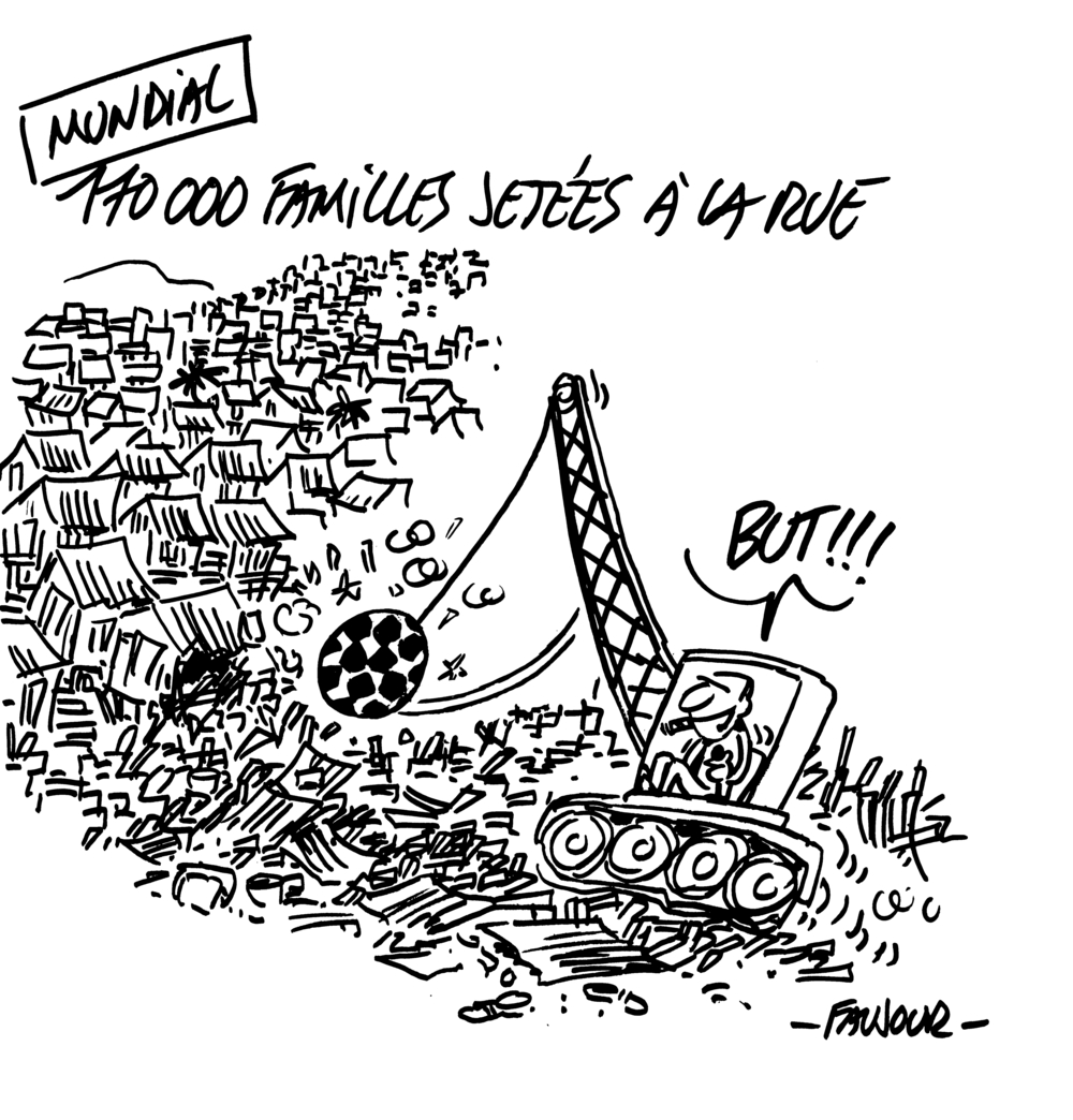 À qui profite le match ?Pour la FIFA, et toutes les firmes avec qui elle travaille en bonne entente (Coca Cola, Adidas, McDonald’s…), l’enjeu est donc de taille. Tous les quatre ans, le Mondial est l’occasion de réaliser de juteux bénéfices sur le dos des budgets publics du pays accueillant. Et peu importe bien entendu l’état de délabrement dans lequel ils laisseront la situation sociale du pays. Denier hôte en date, l’Afrique du Sud a vu les surcoûts liés au Mondial dépasser les 1 700 %, faisant doubler la dette extérieure du pays ! Et chacun sait à qui la facture des dettes publiques est présentée par les gouvernements à la solde de l’ordre dominant : au peuple, même lorsque plus de la moitié de celui-ci vit au-dessous du seuil de pauvreté, ce qui est le cas en Afrique du Sud. Au Brésil, les promesses politiques initiales – le financement du Mondial serait privé et les retombées publiques – se sont rapidement inversées. Des 600 millions d’euros qui devait être assurés par des fonds privés, le budget de fonctionnement a explosé et fluctue selon les versions autour de 2,5 milliards d’euros. Seule certitude, l’argent public le renflouera dans l’écrasante majorité des cas. Le coût lié aux infrastructures, lui, est estimé à plus de 10 milliards. Quant à la suractivité économique liée à l’affluence de l’événement, ce ne sont pas les petits vendeurs à la sauvette, nombreux au Brésil, qui pourront en profiter : un périmètre de 2 kilomètres de sécurité, surprotégé par l’armée et la police, a été installé autour des stades et strictement réservé à l’activité commerciale dûment agréée par la FIFA. Stades et autres infrastructures pour lesquelles 170 000 familles vivant dans les favelas ont été délogées de force.