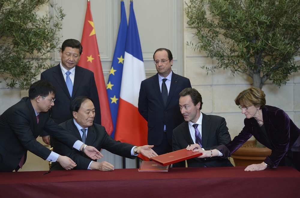Les limites de la politique du styloL’Élysée annonce la signature de grands contrats pour 18 milliards d’euros, mais il s’agit avant tout de « l’officialisation » d’accords déjà négociés dans l’automobile (PSA-Dongfeng) ou l’aéronautique avec l’européen Airbus : une commande de 43 appareils moyen-courriers A320 et 27 long-courriers A330. L’achat des long-courriers avait été gelé par Pékin en représailles au projet européen de taxer les émissions de CO2 des compagnies étrangères. Airbus a en outre annoncé l’extension pour dix ans de son entreprise commune avec Aviation Industry Corporation of China (AVIC) pour assembler les avions de la famille A320 dans l’usine de Tianjin. L’Européen Airbus Helicopters et l’entreprise chinoise Avicopter ont annoncé un accord portant sur la production conjointe de 1 000 hélicoptères civils EC175/AC352.Impossible, en revanche, de conclure le projet d’usine de retraitement des combustibles nucléaires usés présenté par Areva : les négociations se poursuivront… La construction de deux nouveaux réacteurs EPR à Taishan n’a pas été évoquée. Total a signé avec le pétrolier CNOOC un accord prolongeant jusqu’en 2019 la livraison de gaz naturel liquéfié (GNL) au groupe public chinois…Pas de quoi pavoiser du côté français. Le rêve chinois de François Hollande reste pour l’heure un rêve : son salut ne viendra pas de Pékin.