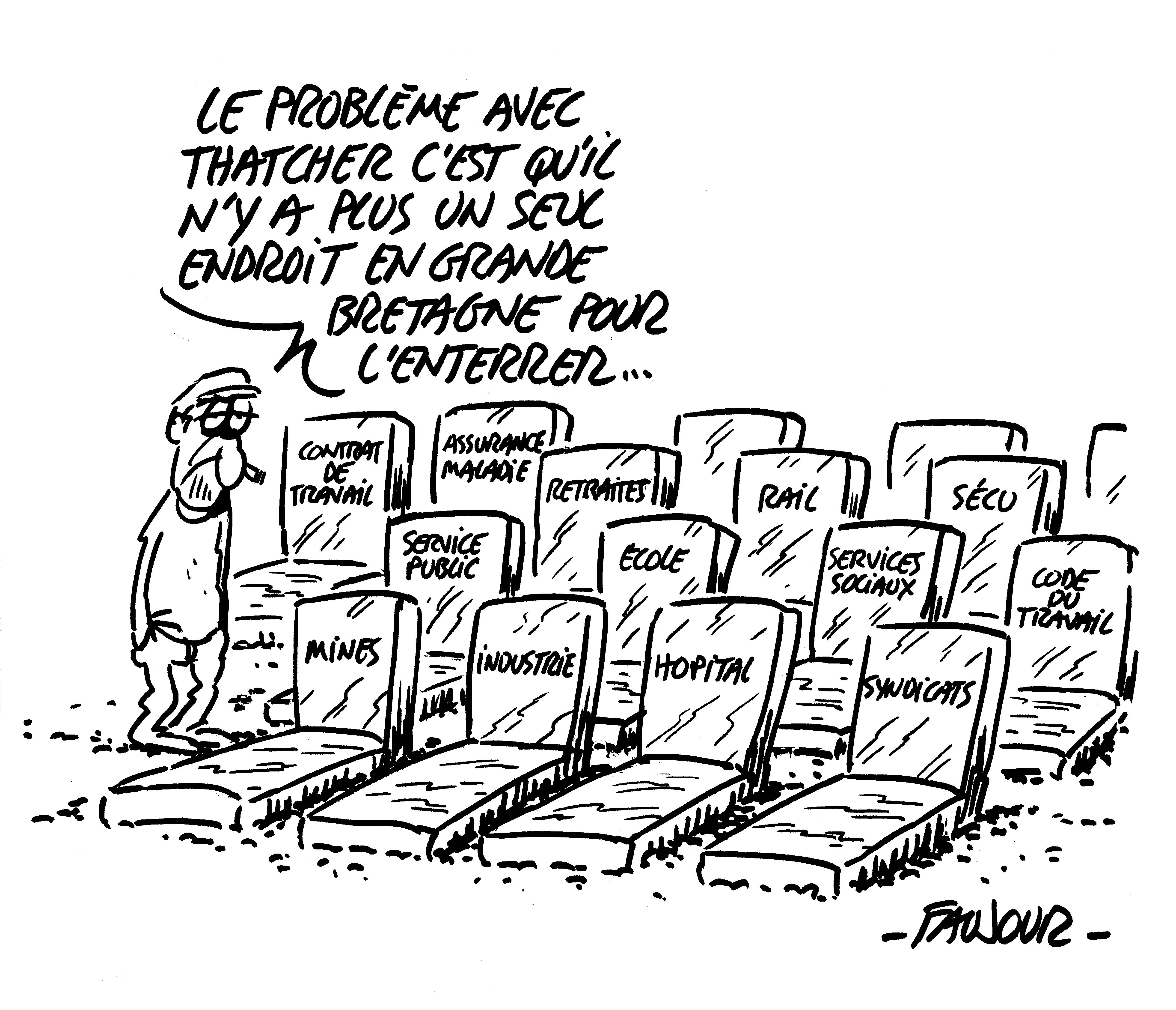 Après l’annonce de la mort de Margaret Thatcher, une des choses les plus frappantes en Grande Bretagne a été l’explosion de joie de tant de personnes : les fêtes dans la rue et dans les pubs, les blagues qui circulent et la chanson du vieux film le Magicien d’Oz, « La sorcière est morte ! » visionnée en boucle sur You Tube et qui grimpe même à la dixième place des ventes.Lors de la mort d’une vieille femme réactionnaire, affaiblie par la maladie et absente de la scène publique depuis si longtemps, certains auraient pu s’attendre à un simple « Bon débarras ! » ou un « On ne la pleurera pas ». Mais c’est mal connaître la haine que des millions de personnes ont ressentie à l’égard de Thatcher et de sa politique pendant les années où elle était au pouvoir.Dossier coordonné par Ross HarroldRepères chronologiques1925 Naissance de Margaret Roberts.1951 Épouse l’homme d’affaire Denis Thatcher.1959 Élue député à Londres.1971 Ministre de l’Éducation déjà détestée quand elle abolit le lait gratuit pour les écoliers de plus de sept ans.1972 Des grèves non officielles empêchent les tentatives des conservateurs d’imposer des lois antisyndicales.1re grève nationale des mineurs de charbon victorieuse.1974 Deuxième grève des mineurs. Le Premier ministre conservateur Heath appelle à des élections générales autour du thème « Qui gouverne le pays, nous ou les mineurs ? » Les électeurs choisissent les mineurs et les conservateurs perdent.1975 Thatcher devient leader du Parti conservateur dans l’opposition.1979 Victoire des conservateurs. Thatcher élue Premier ministre.1981 Bobby Sands, membre de l’IRA et gréviste de la faim, élu député le 9 avril. Il mourra le 5 mai.1981 Des émeutes à Londres, Liverpool, Manchester,Birmingham et dans des dizaines de villes.1982 Guerre des Malouines.1983 • Réélection des conservateurs qui profitent de la fièvre nationaliste et de l’absence d’opposition travailliste.• Missiles nucléaires US installés en Angleterre et campagne pour le désarmement.1984 • Début de la grève des mineurs qui durera un an.• Attentat à la bombe de l’IRA contre le congrès annuel du Parti conservateur. Thatcher échappe de peu à la mort.• Grèves de dockers contre le transport du charbon en juillet (10 jours) et août (3 semaines) mais qui n’aboutissent pas.• Le dirigeant du Parti travailliste, Kinnock, refuse de parler aux côtés du dirigeant du syndicat des mineurs, Arthur Scargill, lors d’une série de meetings.• Les dirigeants des principaux syndicats refusent d’organiser des actions en faveur des mineurs.1985 En mars les mineurs reprennent le travail.1987 Réélection des conservateurs.1989 Nouvelle taxe sur les habitations, la Poll Tax.1990 • Manifestions de masse contre la Poll Tax.• Les caciques du Parti conservateur craignent pour leurs sièges aux futures élections et poussent Thatcher à la démission.• John Major la remplace et abolit tout de suite la Poll Tax.Grève des mineurs : une épreuve de force perdueLe premier mars 1984 a débuté la plus grande grève de toute l’histoire du mouvement ouvrier britannique. Pendant un an, 140 000 mineurs du charbon ont tenu tête à Margaret Thatcher et son gouvernement.Parmi toutes les grèves et occupations de la précédente période bouillonnante du début des années 1970, ce furent les deux défaites humiliantes infligées aux conservateurs en 72 et 74 par les mineurs qui marquèrent Thatcher et l’ensemble de la classe dominante britannique (Voir article dans Tout est à nous ! n°191).Tirant les leçons de ces défaites, Thatcher et ses proches conseillers élaborent en 1978 dans le plus grand secret un plan détaillé. Arrivée au gouvernement en 1979, Thatcher s’attaque d’abord aux secteurs les plus faibles. Avant d’affronter enfin les mineurs, Thatcher applique les derniers éléments du plan. Certaines centrales électriques sont converties pour pouvoir fonctionner avec du fioul au lieu du charbon. D’énormes stocks de charbon sont accumulés. Des chauffeurs de camion non syndiqués sont organisés pour traverser les piquets de grève. Enfin, la police, historiquement décentralisée, est réorganisée afin de pouvoir coordonner la répression au niveau national. Il ne reste plus qu’à choisir la date pour provoquer l’affrontement, en annonçant la première d’une longue liste de fermetures de mines à la fin de l’hiver, au moment où les besoins en énergie baissent. Et pourtant, malgré toute cette préparation, les choses ne se passent pas comme Thatcher l'avait prévu.Une vague de solidaritéContre les piquets de grève, la police intervient massivement et avec une violence jamais vue (à part en Irlande du Nord !). Dans les villages miniers, elle se comporte comme une véritable armée d’occupation, en multipliant les contrôles et les arrestations. Les tribunaux fonctionnent à plein régime et les grands médias relaient la propagande de Thatcher, qui qualifie les mineurs d’« ennemis intérieurs », en référence à l’« ennemi extérieur », vaincu deux ans auparavant aux Malouines. Cette violence ne fait que renforcer leur détermination et celle du nombre croissant de leurs soutiens.Des centaines de milliers de personnes formeront un véritable réseau à travers le pays. Pendant des mois, ils se mobiliseront pour collecter de l’argent, au travail, dans la rue, dans les pubs, pour envoyer des colis, organiser des meetings et des manifestations de soutien, le jumelage des villes et des villages. Des mineurs seront envoyés partout dans le pays mais aussi en Europe et au-delà pour organiser le soutien. Le syndicat avait peu d’argent à distribuer aux grévistes et le peu qu’il avait finira par être bloqué par les tribunaux ! Le gouvernement a fait pression pour que les allocations sociales soient retirées aux familles grévistes et on a même refusé à une famille les