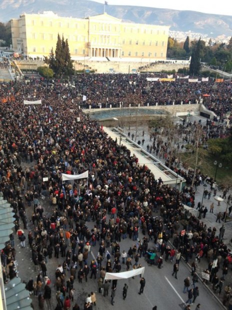 Dimanche 12 février, plus de 80 000 personnes se sont rassemblées à Athènes pour refuser le nouveau train de mesures de misère que le gouvernement dit d’union nationale a fait semblant de marchander avec la troïka (FMI, Union européenne, Banque européenne).Ce dimanche soir, les interventions des députés au Parlement ont quelque chose d’irréel : toute la semaine, des dizaines de milliers de travailleurEs se sont mobiliséEs partout dans le pays, sous diverses formes. Et comme si de rien n’était, 199 députés viennent de voter le plan,avec sa mesure symbolique : baisse de 22 % du Smic, se traduisant pour les jeunes travailleurEs par une baisse encore plus forte qui les doterait d’un salaire d’environ 500 euros.