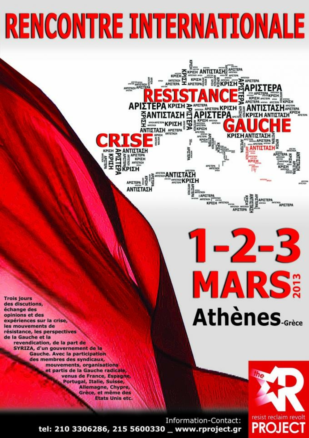À l’initiative de « Rproject » – coordination du DEA, de Kokkino et Apo, forces de la gauche de Syriza – a eu lieu du 1er au 3 mars à Athènes une rencontre anticapitaliste internationale. Celle-ci a rassemblé près d’un millier de personnes.Étaient présents des animateurs de la gauche de Syriza – qui a obtenu plus de 25 % des suffrages lors de leur dernière conférence nationale, des syndicalistes de toute l’Europe dont Georgio Chremaschi de la direction de la Fiom (fédération de la métallurgie italienne), des économistes dont Michel Husson, Daniel Albaracin et Kostas Lapavitsas, ainsi que des délégations de différents pays : Suisse, Italie, Espagne, Portugal, USA, et France, avec des militantEs du NPA dont Olivier Besancenot.Cette rencontre a permis une discussion passionnante sur la situation en Grèce, en Europe mais aussi sur les tâches des anticapitalistes dans le mouvement syndical, les services publics et dans la lutte antifasciste. La rencontre s'est terminée par une discussion sur les révolutions arabes animées par Gilbert Achcar et Ahmed Shawki.On ne peut saisir la singularité, la force et l’espoir que symbolise Syriza sans prendre en compte la profondeur de la crise grecque. Le pays est démoli par les politiques d’austérité. Les classes populaires sont saignées : un chômage officiel de près de 30 %, des baisses de salaires de 30 ou 40 % voire plus, des hôpitaux sans médicaments ou des médicaments hors de prix. À Athènes, des milliers de devantures de commerce sont fermées et la décomposition politique du pays accompagne la désolation économique, avec une montée des fascistes de l’Aube Dorée. Et malgré tout cela, le peuple grec vit, survit, résiste. La fatigue sociale et politique se fait sentir, après 29 journées de grève nationale depuis le début de la crise, mais la mobilisation est là.Un « gouvernement des gauches »C’est dans ce contexte que la discussion de la rencontre s’organisa autour des tâches pour passer de la mobilisation de masse actuelle contre l’austérité à la construction d’un mouvement social et politique pour renverser le gouvernement de Samaras et instaurer un « gouvernement des gauches » contre l’austérité : un gouvernement transitoire de rupture avec les politiques d’austérité et celles de l’Union européenne, un gouvernement des gauches sans Pasok ou forces bourgeoises. Comme l’explique, Antonis Davanellos, responsable du DEA, il s’agit de lutter pour un « gouvernement des gauches » – Syriza, KKE, Antarsya – qui « défende les classes populaires », et pas un « gouvernement de salut ou d’union nationale avec des représentants capitalistes » comme l’ont défendu certains dirigeants de Syriza dans les dernières semaines. À cette étape, la force de Syriza a été de combiner résistance sociale et perspective politique de rejet des diktats « austéritaires » de l’Union européenne. Un gouvernement de gauche ne prend son sens que sur une telle base. Pour aller le plus loin possible, cette perspective doit s’appuyer sur la mobilisation et l’auto-organisation sociale. « Il faut tenir bon sur cette ligne », nous explique la gauche de Syriza. Rechercher des alliances pour une reconstruction nationale avec des secteurs du capitalisme grec ne peut que s’opposer à un programme de défense des intérêts populaires. La situation est critique. Les enjeux au sein de Syriza sont considérables. Les pressions de l’Union européenne et des classes dominantes sont énormes. Syriza nous appelle à la résistance. Il faut répondre par notre solidarité.François Sabado