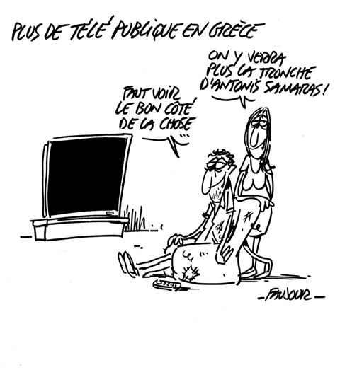 Vers la démission du gouvernement ?Outre l'écran noir de mardi, il faut rappeler qu'en quelques mois, la troïka intérieure a procédé à trois mesures de réquisition de grévistes, ôtant donc ce droit fondamental au personnel du métro, puis aux marins et aux professeurs. Dans le même temps, les nazis bénéficient d'une impunité inquiétante pour leurs crimes, dont le dernier est ce député proclamant sans honte à l'assemblée son négationnisme du génocide des Juifs. Que ce soit pour le droit de grève ou contre les nazis, on peut espérer que la mobilisation populaire en faveur de ERT va désormais prendre les mêmes formes, avec notamment le soutien uni des artistes et des intellectuels, pour lancer une contre-offensive démocratique devenue urgente et centrale.Si Samaras garde le soutien des grands requins audiovisuels privés, s'il va vouloir casser cette vague de solidarité, il est clair en même temps que l'actuelle mobilisation peut déboucher très vite sur une question concrète : la démission du gouvernement. Se pose donc très concrètement la question du gouvernement qui pourrait être mis en place pour commencer à prendre les mesures anti-austérité : sur ce plan, l'absence de réponse claire et massivement crédible pèse et affaiblit les luttes, quelle que soit leur puissance. La mobilisation autour de ERT pourrait faire accélérer les clarifications pour un débouché politique.L'annulation par la justice du décret gouvernemental de ERT est une première victoire. La mobilisation doit continuer.