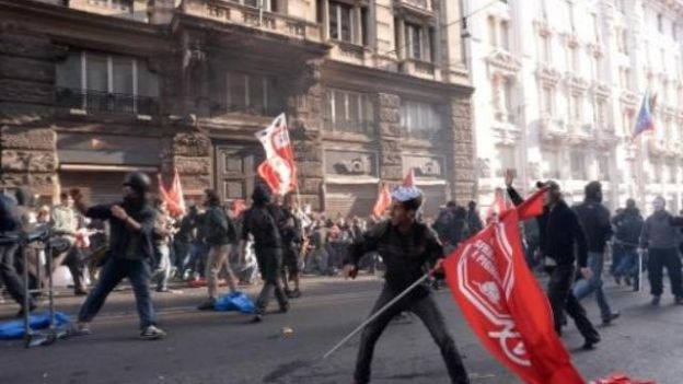 Le nouveau décret gouvernemental « jobs act » accroissant la flexibilité, et le projet de « simplification du code du travail », cautionnés par les directions syndicales, sont à l’origine de cette mobilisation nationale, regroupant des mouvements aussi divers que les Notav (mouvement anti-TGV du Val d’Aoste), No Muos (contre la répression en Sicile), différents centres sociaux, ou des associations de défense du droit à l’avortement. Parmi les nombreuses banderoles émaillant le cortège, celle des étudiants « Des métropoles aux universités nous assiégerons l’austérité et la précarité »... « Maison Revenu Dignité »... Sous les ovations des manifestants, les Anonymous annonçaient l’attaque réussie du site de la présidence du Conseil, tandis que des bâtiments officiels étaient la cible de nombreux jets de détritus. Des affrontements très violents entre une partie des manifestants et la police anti-émeutes ont éclaté aux environs de Piazza Barberini faisant une trentaine de blessés.