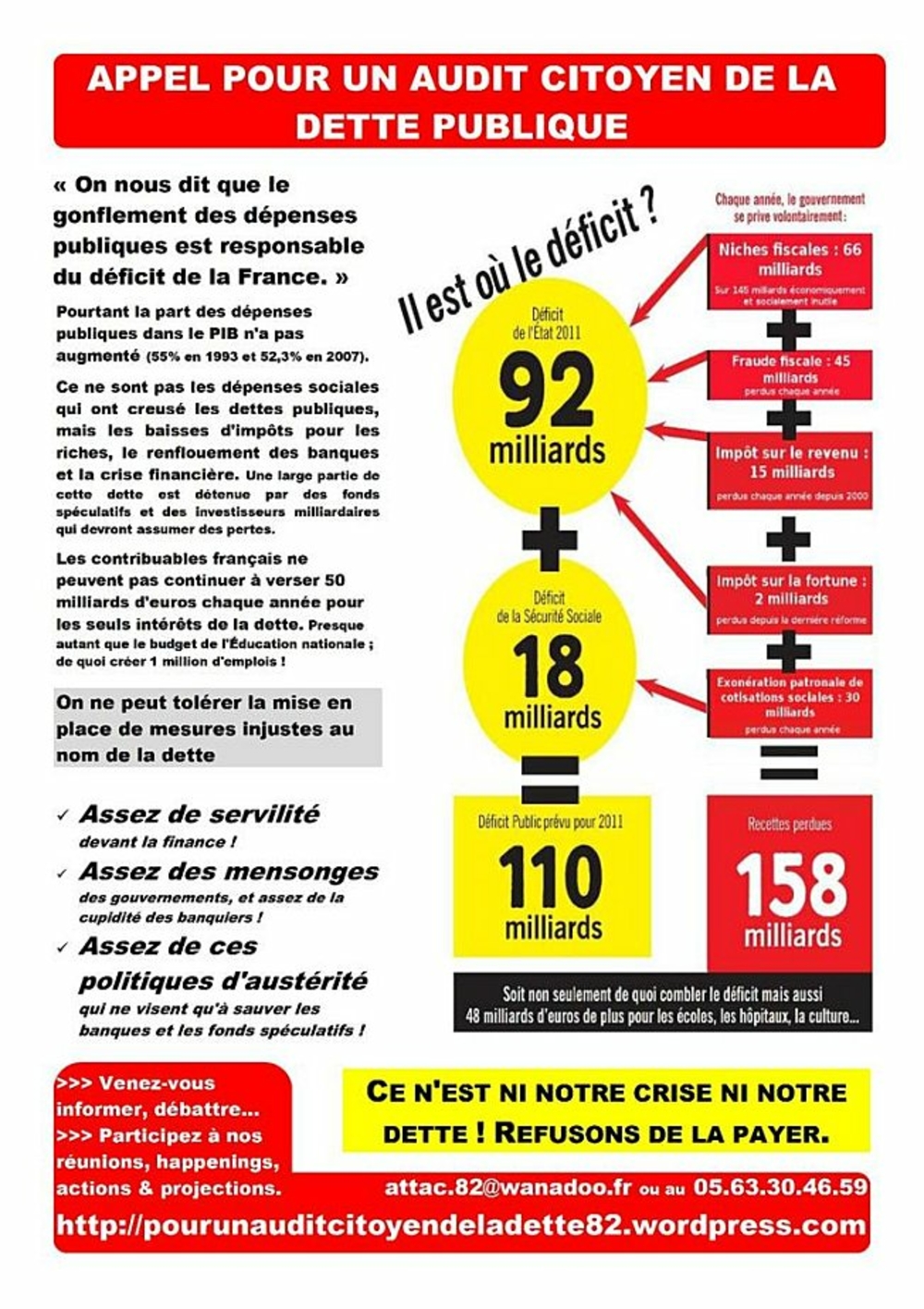 L’exercice de l’audit n’est pas un exercice réservé à des experts. Ils sont évidemment bienvenus et peuvent apporter beaucoup au travail collectif de l’audit citoyen. Mais un collectif peut commencer le travail sans nécessairement être assuré d’une telle participation. C’est en entreprenant les recherches et en provoquant un débat public qu’en cours de route les collectifs s’étofferont et réuniront différentes expertises. Chacun d’entre nous peut y prendre part et se mettre au travail pour mettre en lumière le processus d’endettement public. En 2011, un collectif national s’est mis en place en France pour un audit citoyen de la dette (audit-citoyen.org). Il rassemble de nombreux mouvements sociaux et politiques, et l’appel à sa constitution a été signé par plusieurs dizaines de milliers de personnes. Dans le cadre de cette démarche, des collectifs locaux se sont mis en place un peu partout dans l’hexagone. On peut d’ailleurs partir de réalités localesafin de participer à l’audit des dettes publiques. On peut commencer par analyser les emprunts structurés vendus aux collectivités locales par Dexia ou d’autres banques. À ce propos, un travail est déjà réalisé: l’association «Acteurs publics contre les emprunts toxiques» rassemble une dizaine de collectivités locales (empruntstoxiques.fr). On peut aussi commencer par étudier les difficultés financières rencontrées par les hôpitaux publics présents sur le territoire. Des initiatives pour des audits citoyens se développent également en Grèce, en Irlande, en Espagne, au Portugal, en Italie et en Belgique.