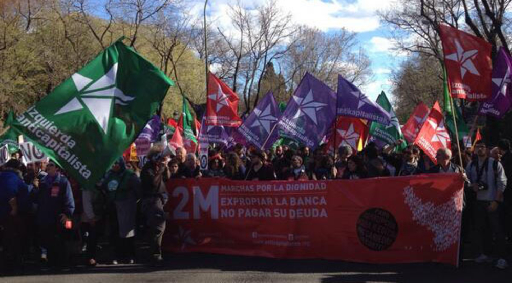 Vers la grève générale ?Organisées à l’origine par le SAT (Syndicat andalou des travailleurs) et élargies ensuite à l’ensemble du mouvement social (« mareas », Indignés, syndicats «lutte de classes », etc.), ces marches « autogérées » se sont structurées autour de revendications essentielles : le non-paiement de la dette, l’arrêt des politiques d’austérité et de la privatisation des services publics, une démocratie « réelle »et la fin du régime politique (hérité du franquisme en 78), la fin de l’impunité pour la corruption, et le départ des « gouvernements de la Troika ».Et la suite ? Pendant la manif, le mot d’ordre de grève générale, qui était aussi bien partagé par des boîtes en lutte que par les étudiantEs, les mineurs, les pompiers, les travailleurs des services publics et d’autres, s’est imposé comme thème central de l’AG organisée lundi 24 mars. Ce qui est donc proposé maintenant à la discussion par l’ensemble des mouvements, c’est la préparation d’une grève générale interprofessionnelle de 3 jours au mois de mai.Fait notable et remarqué : l’absence totale dans cette mobilisation, après le boycott, des principaux syndicats, UGT et CO dirigés par le PSOE et IU (PC) –des bureaucraties syndicales occupées depuis fort longtemps par des affaires de corruption et le fameux « dialogue social » à la sauce locale !À noter enfin le beau cortège (1 500 personnes) des camarades de Izquierda Anticapitalista totalement impliqués dans les luttes et les marches.Si podemos !