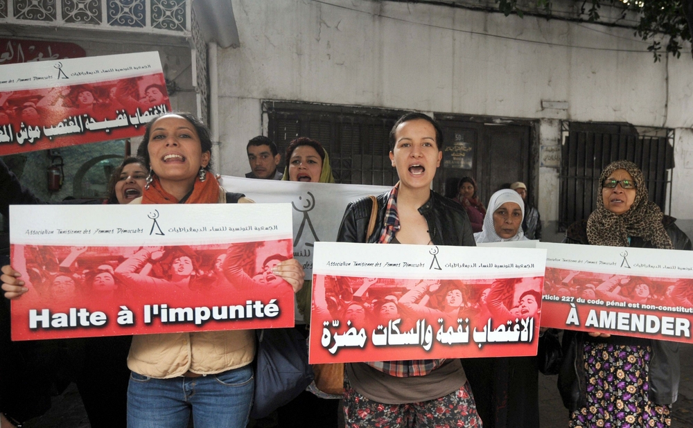 Violences, discours rétrogrades et intimidationsLe viol de Meriem met en lumière l’état de la discrimination à l’égard des femmes en Tunisie. Ce rapport de domination patriarcale se manifeste par une forte présence des violences faites aux femmes en Tunisie. En effet l’enquête nationale réalisée en 2010 trouve que 47,6 % des femmes tunisiennes ont été victimes d’une forme de violence dans leur vie. La violence sexuelle concerne 15,9 % des femmes.Face à cette violence, les différents gouvernements d’avant la révolution et ceux qui ont succédé n’ont toujours pas mis en place une stratégie de lutte contre les violences faites aux femmes. Ce sont les associations et essentiellement l’Association tunisienne des femmes démocrates (ATFD) qui accompagnent les femmes et dénoncent les violences.Une campagne contre les violences sexuelles a été lancée l’année dernière face à la recrudescence de ces violences, face à l’émergence d’un discours rétrograde contre les femmes par des extrémistes religieux, mais aussi face à l’intimidation des femmes par la police dans l’espace public.