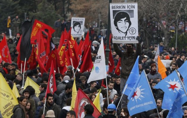 Âgé de quatorze ans, Berkin avait été blessé à la tête par une grenade lacrymogène, alors qu’il était sorti acheter du pain en juin dernier, lors de la révolte de Gezi. Après 269 jours passés dans le coma, ne pesant plus que 16 kilos, le jeune Berkin, « l’enfant de l’espoir », a perdu la vie dans la matinée du 11 mars. L’indignation suscité par son décès s’est traduite le jour même par de nombreuses mobilisations spontanées dans différentes villes du pays, dont la plupart furent attaqués par les forces de l’ordre.Le lendemain, lors des funérailles, la police n’intervint pas lors de la marche de l’immense cortège de Okmeydani (quartier populaire où vivait Berkin) jusqu’au cimetière (marche qui dura près de 4 heures), mais elle n’hésita pas à charger très violemment juste après la cérémonie d’enterrement pour empêcher le cortège de s’avancer vers Taksim afin de déposer des fleurs, à la mémoire du jeune Berkin, au parc Gezi.Bien entendu, personne n’attendait du Premier ministre Erdogan qu’il exprime un quelconque regret ou présente ses condoléances à la famille du défunt, étant donné qu’il ne l’avait pas fait pour les sept autres jeunes décédés lors du soulèvement. De plus, on sait qu’il aime vanter « l’épopée héroïque » de « sa » police. Mais personne ne s’attendait à ce qu’il déclare lors d’un meeting de son parti que Berkin Elvan était un terroriste…