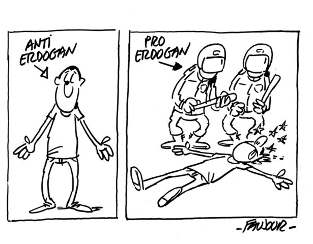 Depuis le début des événements, pour pouvoir mettre fin à cette explosion de masse inattendue, le Premier ministre Erdogan a eu recours à une stratégie reposant sur une véritable violence d’État. Tout d’abord il y a la répression brutale, avec des interventions policières d’une violence inouïe causant la mort de trois résistants (dont un avec une balle dans la tête). Parmi les 8 000 blesséEs, plus d’une dizaine ont perdu un œil. La violence policière a atteint son sommet lors de l’intervention qui a eu lieu en fin de semaine dernière, afin d'évacuer totalement le parc Gezi : usage démesuré de gaz lacrymogène à l’intérieur du parc où se trouvaient aussi beaucoup de familles avec enfants, de même que dans les halls d’hôtel où se réfugièrent les manifestantEs et dans les infirmeries de la résistance ; mise en garde à vue des médecins soignant les résistantEs blesséEs ; présence de véhicules anti-émeute militaires ; ajouts de produits chimiques dans les canons à eau, causant un sentiment de brûlure sur toute la peau… Un véritable état d’urgence non déclaré.