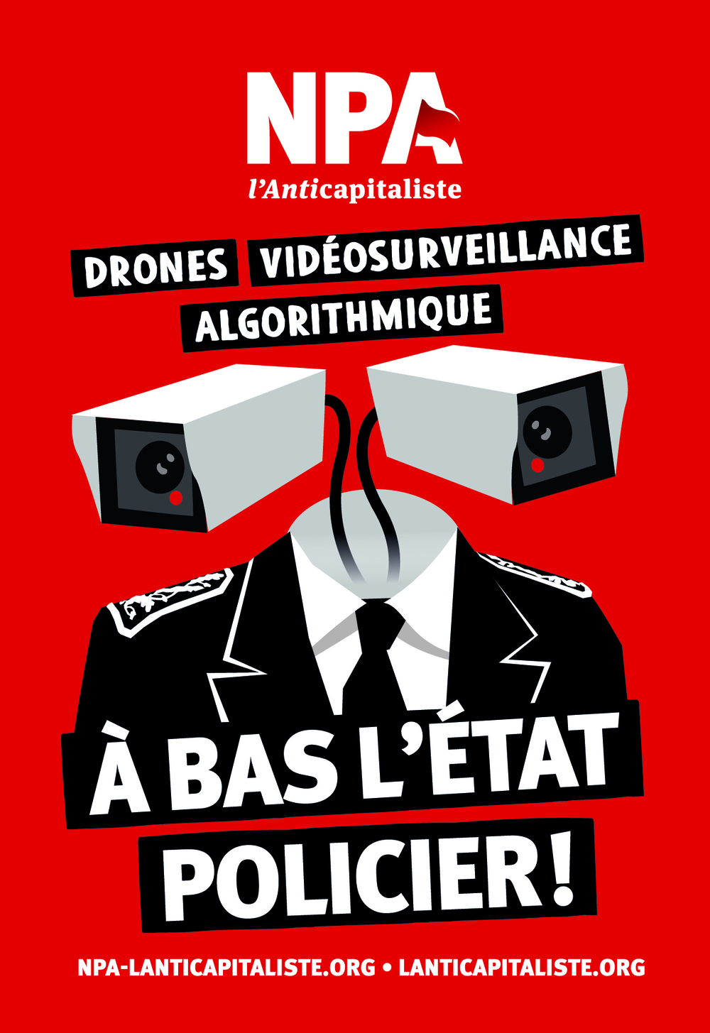 Autocollant : « Drones, vidéosurveillance algorithmique, à bas l'État policier »