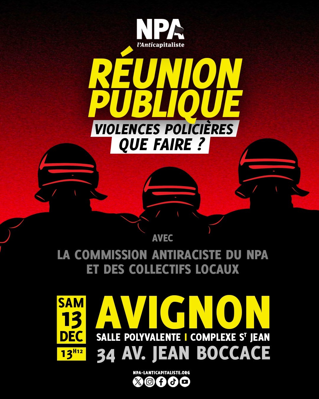Réunion publique du NPA 84 « Violences policières, que faire? », avec la Commission antiraciste du NPA et des collectifs locaux.