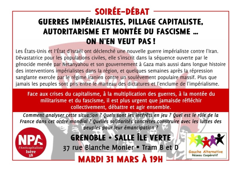 Une soirée organisée par le NPA - l'Anticapitaliste Isère et la Gauche alternative - Réseau coopératif.