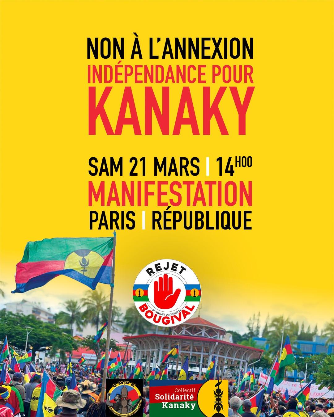 Samedi 21 mars 2026 - 14h00 Manifestation « Non à l'annexion, indépendance pour Kanaky » à l'appel du Collectif Solidarité Kanaky. Rendez-vous samedi 21 mars 2026, 14h à République. Copied to clipboard