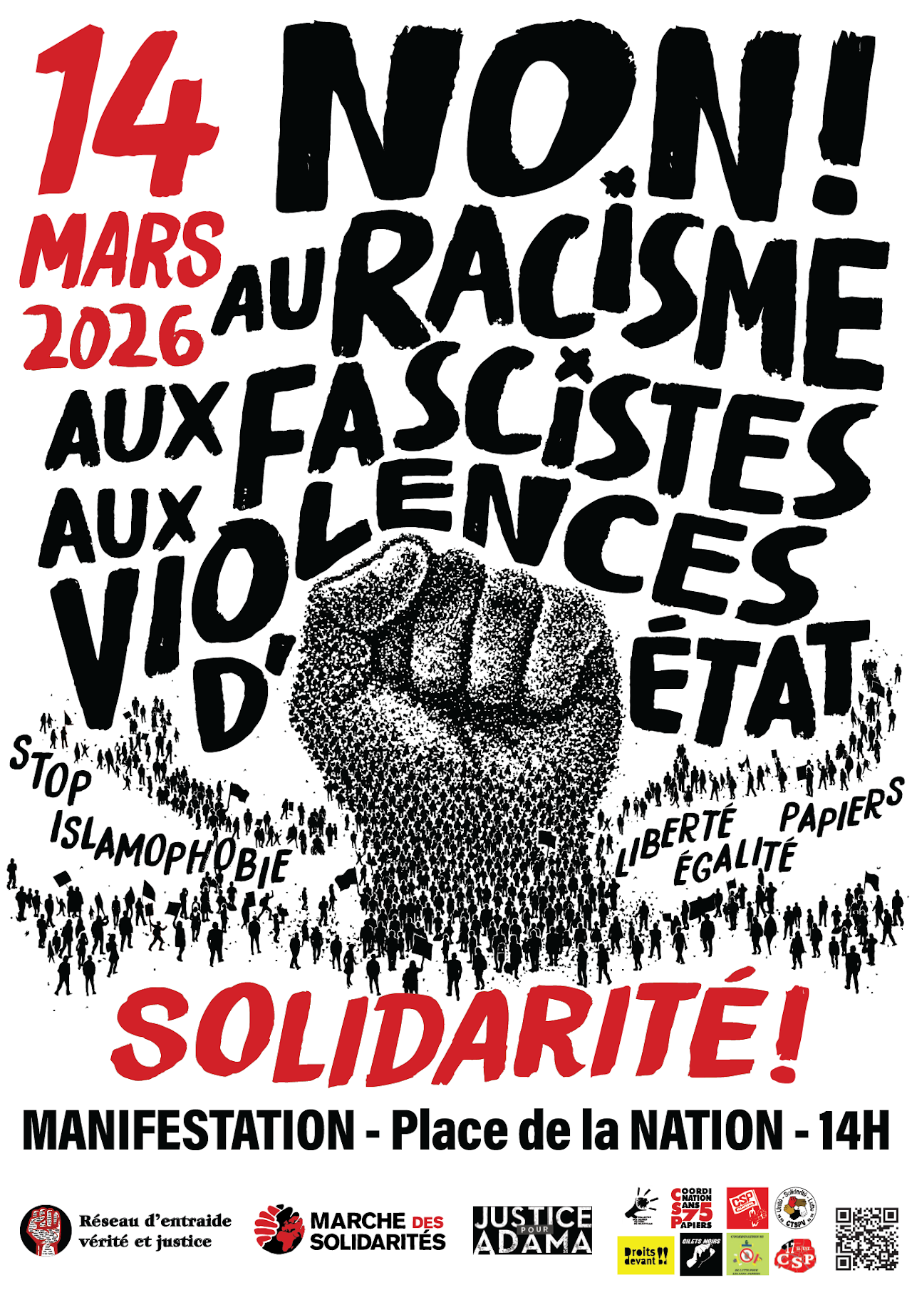 Samedi 14 mars 2026 - 14h00 Rendez-vous samedi 14 mars, 14h à Nation. Plus d'infos sur le site de la Marche des solidarités Copied to clipboard