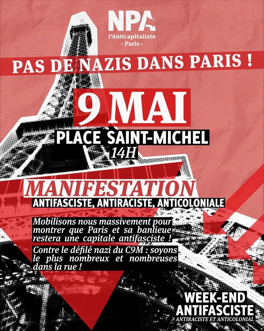 Samedi 9 mai 2026 - 14h00 Manifestation antifasciste, antiraciste, anticoloniale. Rendez-vous 14h place Saint Michel. Plus d'infos ici. Copied to clipboard