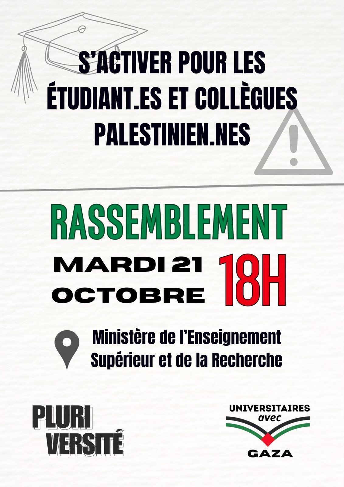 Rassemblement mardi 21 octobre 2021 à 18h devant le Ministère de l'Enseignement et de la Recherche, 1 rue Descartes, 75005 Paris. Métro Cardinal Lemoine.
