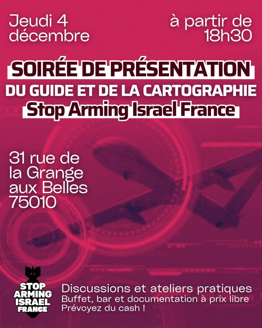 Après la publication de la 2e édition de son Guide des entreprises françaises d'armement complices d'Israël, le collectif Stop Arming Israel France vous invite à une soirée de présentation de ses recherches et des ressources qu'il met à la disposition de tous·tes. Quelles sont les entreprises françaises qui participent au commerce d'armement avec Israël ? Où sont-elles implantées ? Comment agir pour stopper leur complicité ?