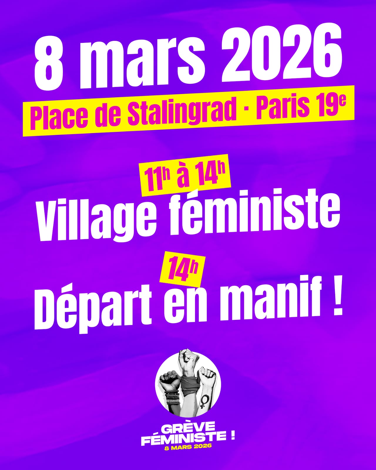 Dimanche 8 mars 2026 - 11h00 Rendez-vous dès 11h pour le village féministe, Place de la bataille de Stalingrad, et à 14h pour le départ en manifestation. Copied to clipboard