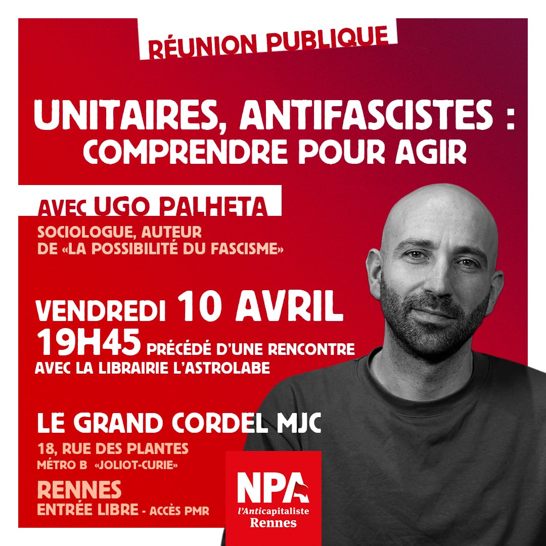 Réunion publique « Unitaires, antifascistes : comprendre pour agir », avec Ugo Paletha.