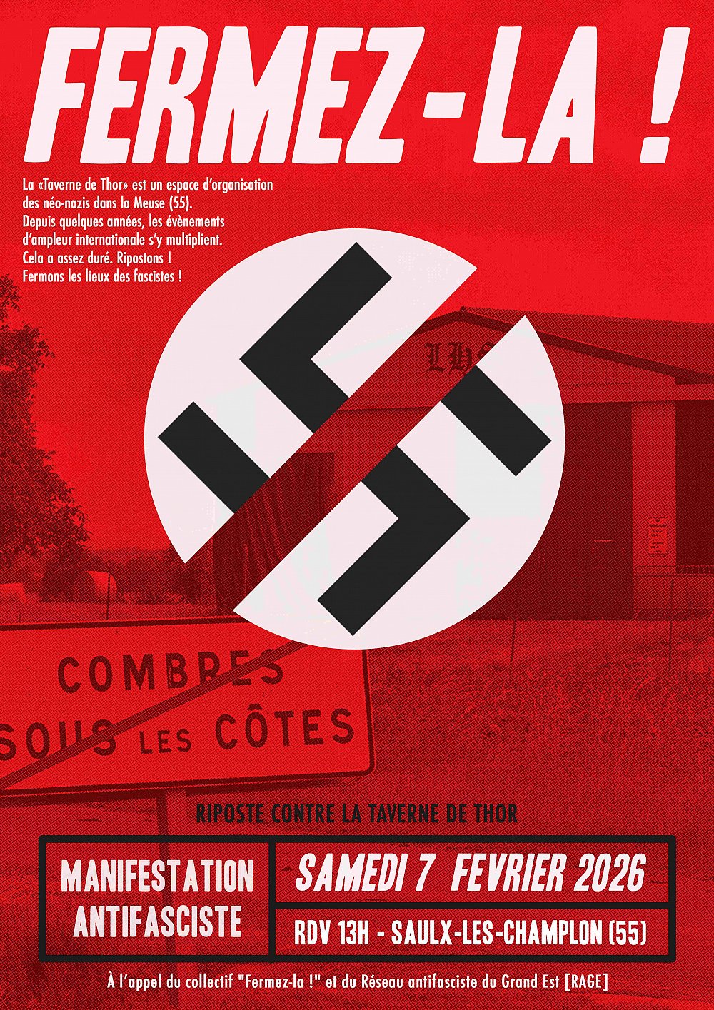 Manifestation antifasciste samedi 7 février 2026 à 13H, au départ de Saulx-lès-Champlon (Meuse), contre la « taverne de Thor ».