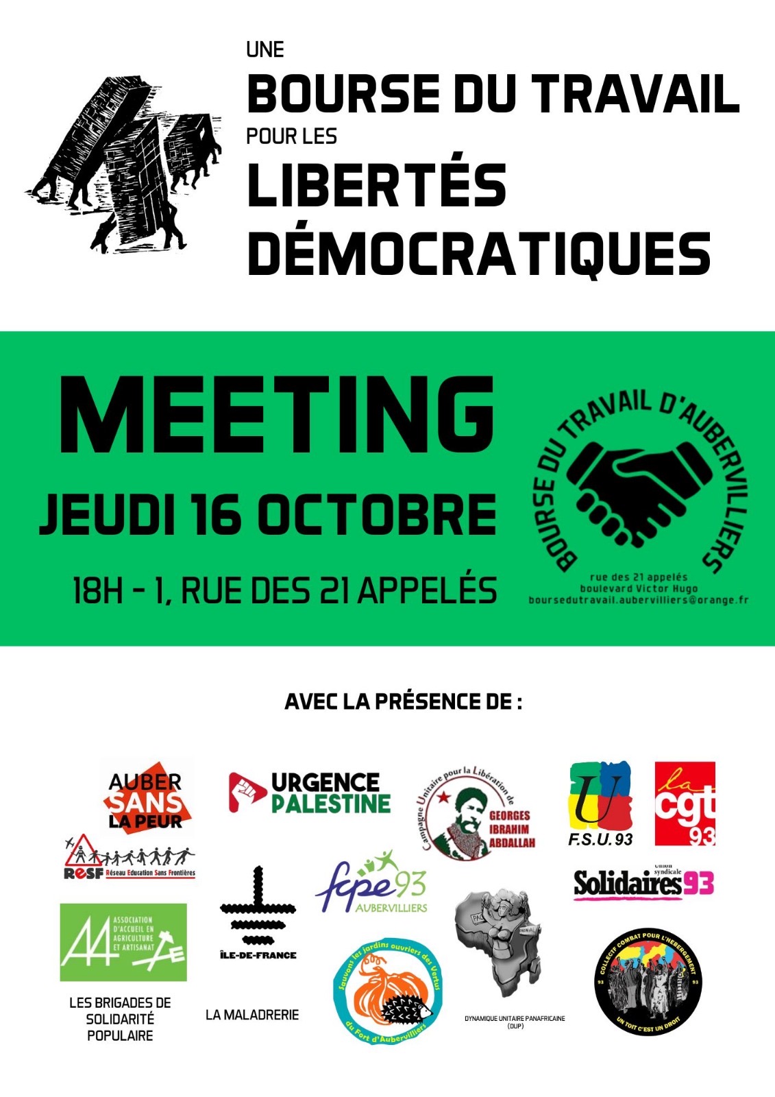 Meeting « une Bourse du travail pour les libertés démocratiques », dans le cadre de la mobilisation pour défendre la Bourse du travail, menacée de fermeture par la mairie, qui l’a assignée au tribunal pour exiger son expulsion. Un procès aura lieu le 27 octobre 2025.