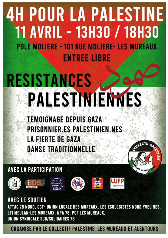 Quatre heures pour la Palestine aux Mureaux, à l'initiative du collectif Palestine les Mureaux et alentours.