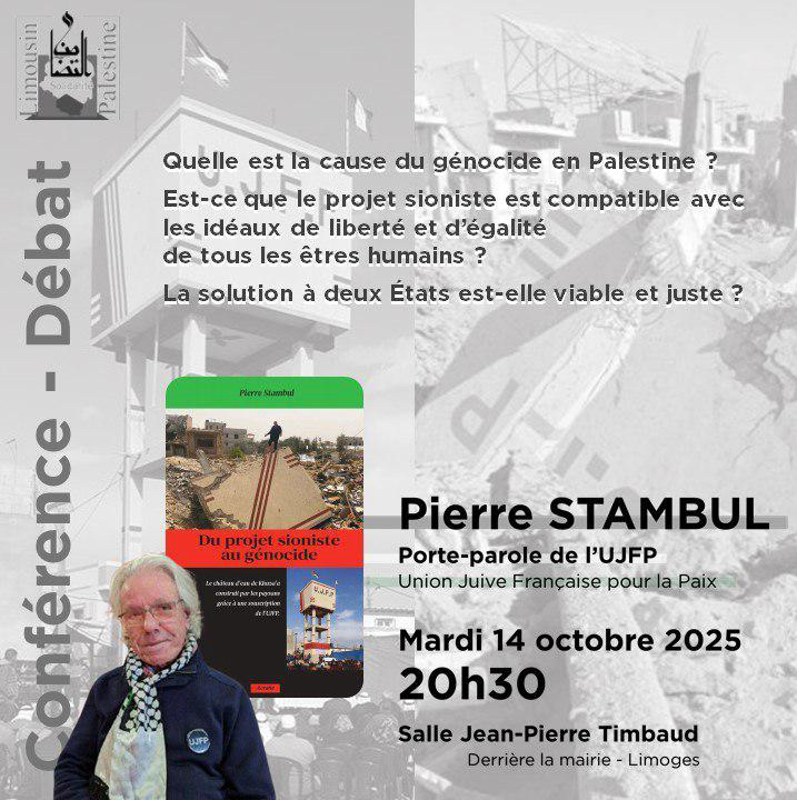 Rendez-vous mardi 14 octobre 2025, salle Jean Pierre Timbaud, esplanade Blanqui à Limoges. NB : la salle est située derrière l'Hôtel de Ville.
