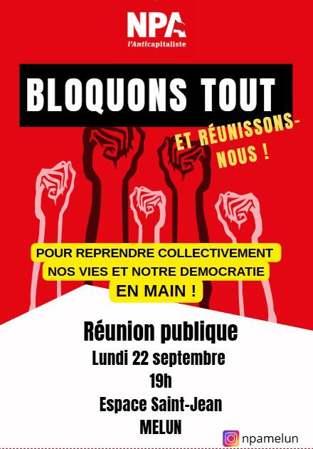 Lundi 22 septembre 2025 - 19h00 « Bloquons tout ! et réunissons-nous ! ». Réunion publique à l'initiative du NPA Melun. Rendez-vous jeudi lundi 22 septembre 2025 à 19h, Espace St Jean, 26 place St Jean à Melun. Copied to clipboard