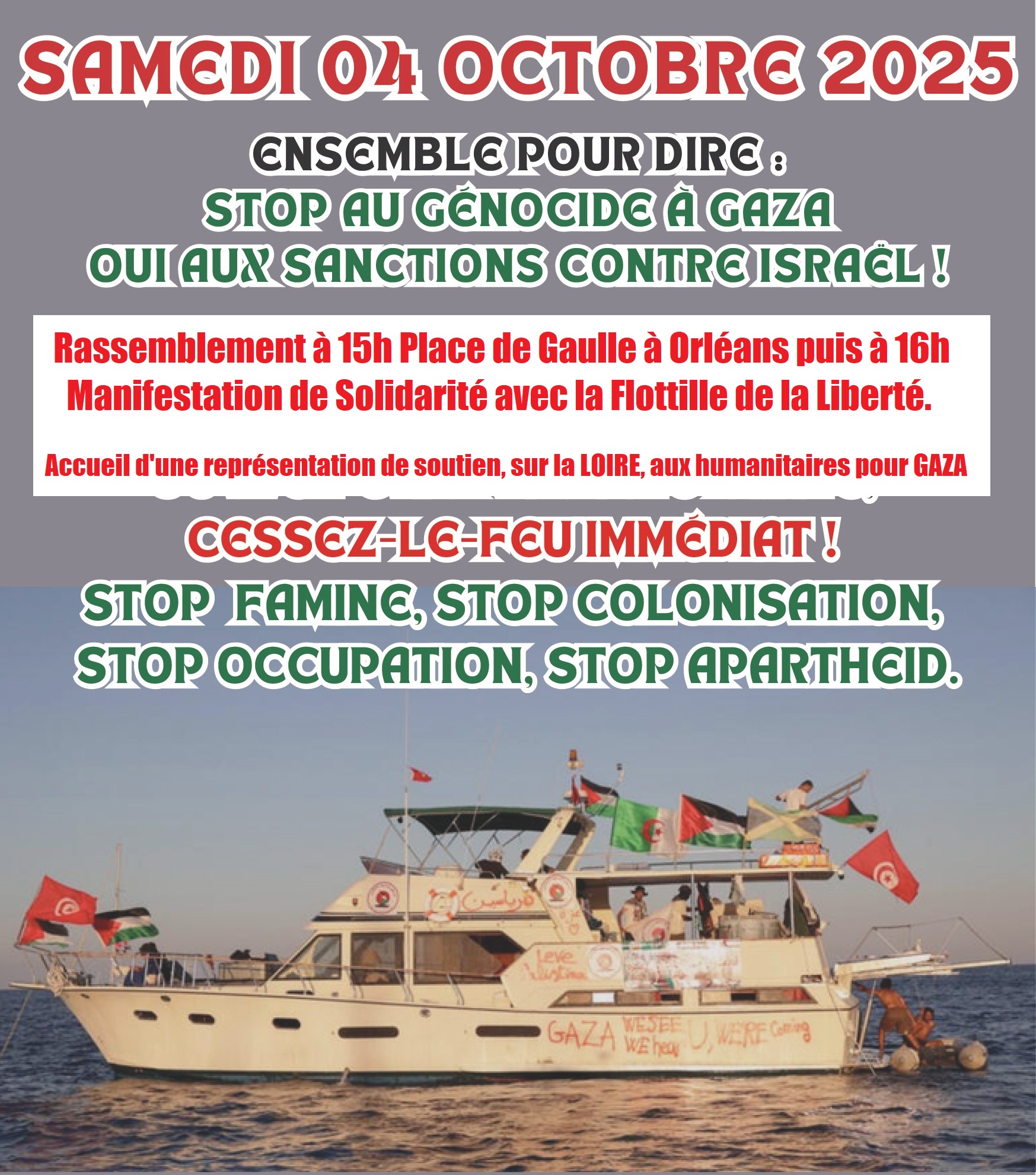 Samedi 4 octobre 2025 - 15h00 Rendez-vous samedi 4 octobre 2025 à 15h place De Gaulle et manifestation en solidarité avec la flottille. Copied to clipboard