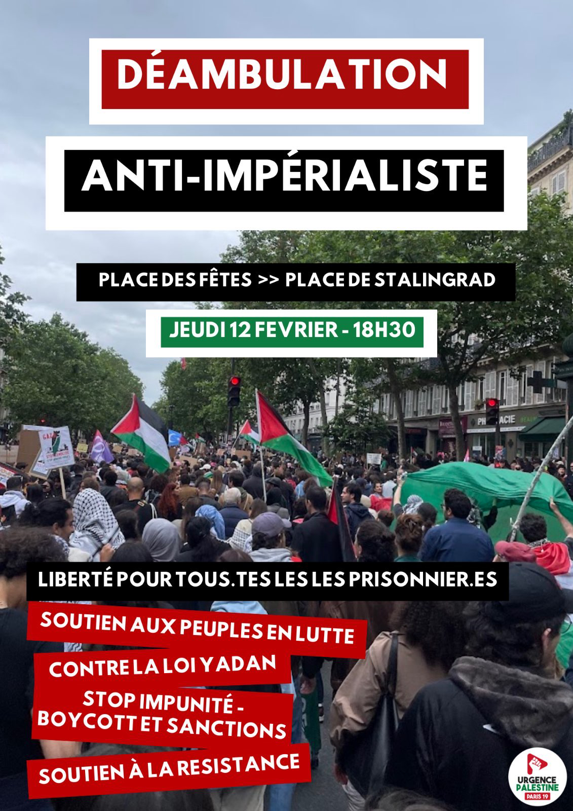 Jeudi 12 février 2026 - 18h30 Déambulation anti-impérialiste dans le 19e, de Place des Fêtes à Stalingrad, jeudi 12 février à 18h30. Copied to clipboard