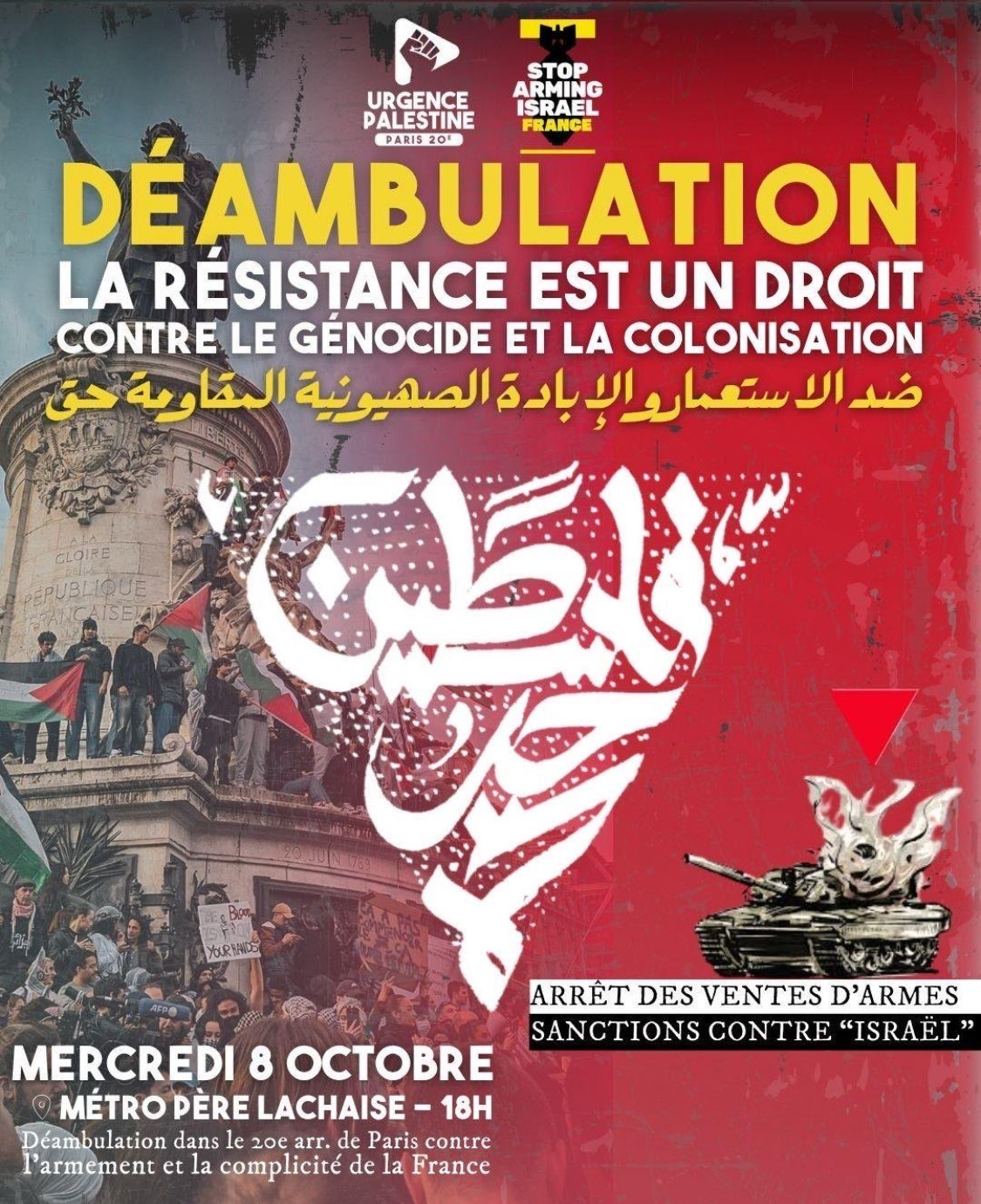 Mercredi 8 octobre 2025 - 18h00 Déambulation dans le 20e, contre le génocide à Gaza et la colonisation, à l'initiative de Urgence Palestine 20e. Rendez-vous mercredi 8 octobre 2025 à 18h métro Père Lachaise. Copied to clipboard