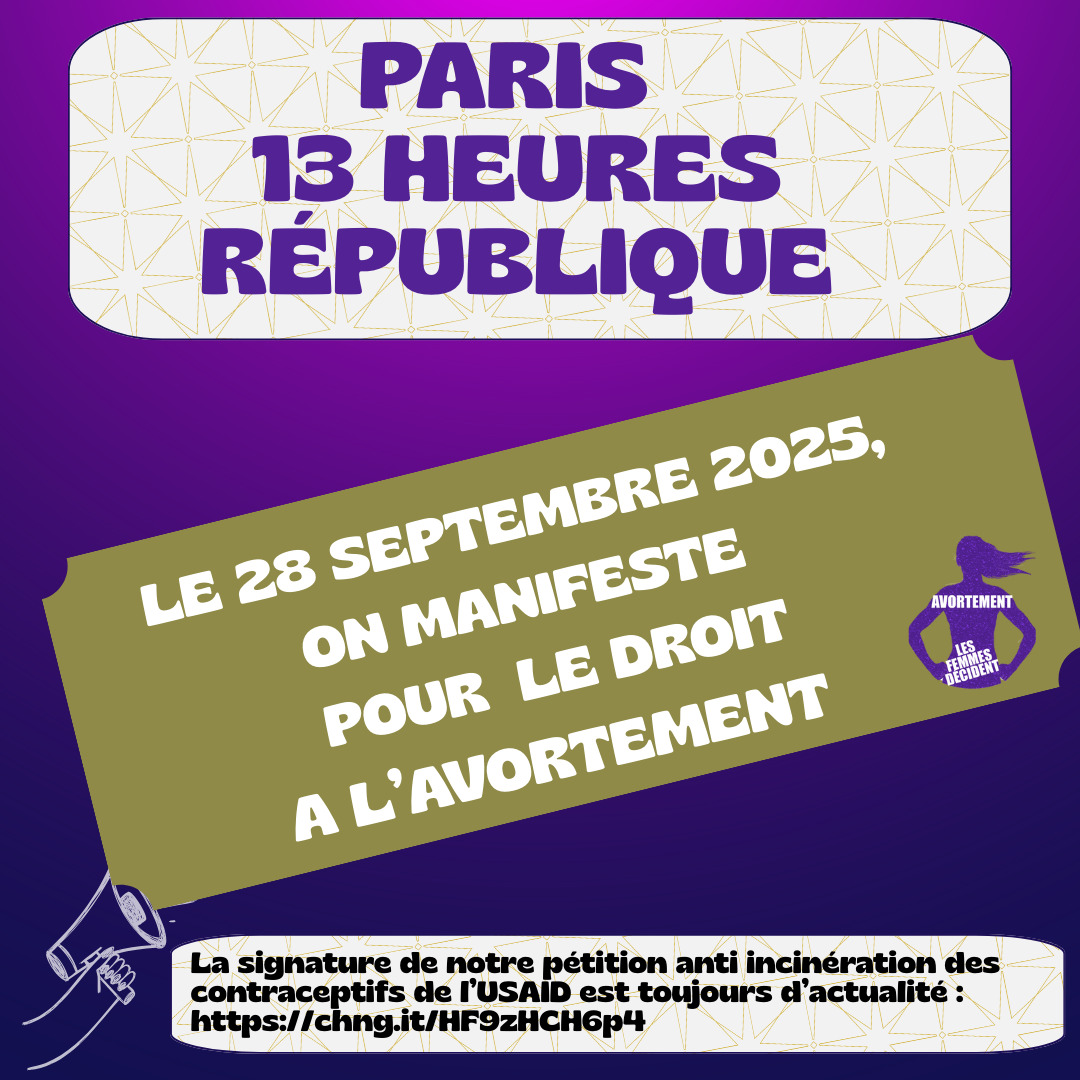 Dimanche 28 septembre 2025 - 13h00 Manifestation dans la cadre de la journée mondiale pour le droit à l'avortement. Rendez-vous dimanche 28 septembre 2025, 13h00 à République Copied to clipboard