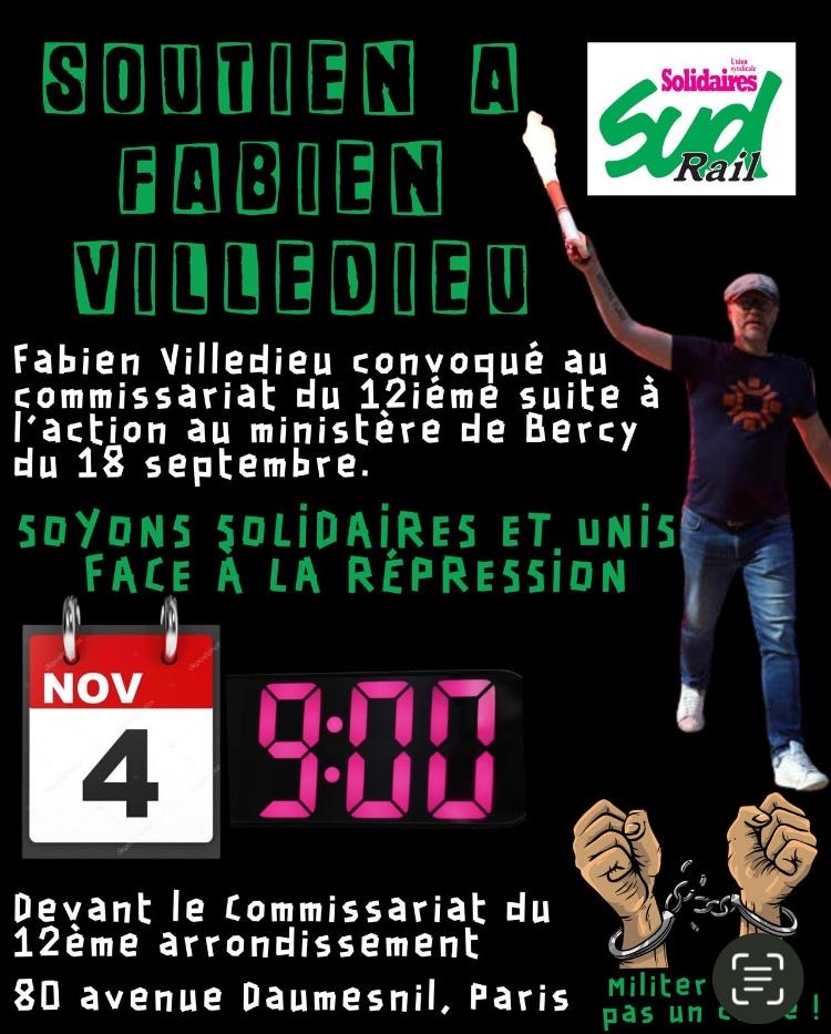 Rassemblement de soutien à Fabien Villedieu, syndicaliste Sud Rail, convoqué au commissariat du 12e à la suite d'une action au ministère des Finances lors de la journée d'action du 18 septembre.