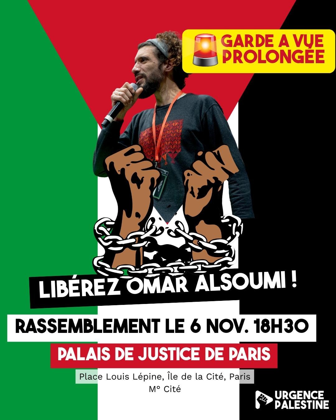 Jeudi 6 novembre 2025 - 18h30 Rassemblement pour exiger la libération immédiate de Omar Alsoumi Rendez-vous jeudi 6 novembre 2025, place Louis Lépine, Île de la Cité. Copied to clipboard