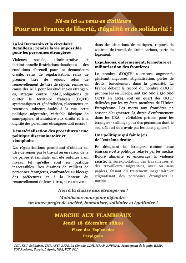 Perpignan (66) : Marche aux flambeaux pour la journée internationale des migrantEs