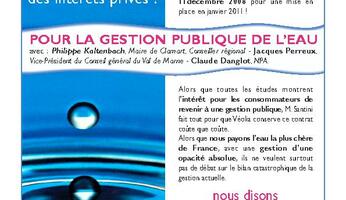 Réunion publique, « Pour la remunicipalisation de l’eau », initiative unitaire (PS, PCF, Verts, NPA, LCR), avec Jacques Perreux (vice-président du conseil général du Val-de-Marne), Philippe…