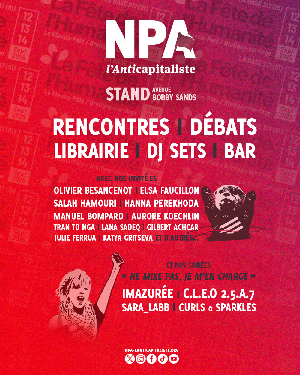 Comme chaque année le NPA-L’Anticapitaliste sera présent à la fête de l’Huma du vendredi 12 au dimanche 14 septembre à Brétigny-sur-Orge, avec un programme riche et varié.