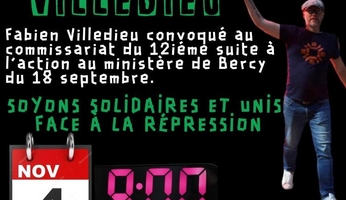 Rassemblement de soutien à Fabien Villedieu, syndicaliste Sud Rail, convoqué au commissariat du 12e à la suite d'une action au ministère des Finances lors de la journée d'action du 18 septembre.…